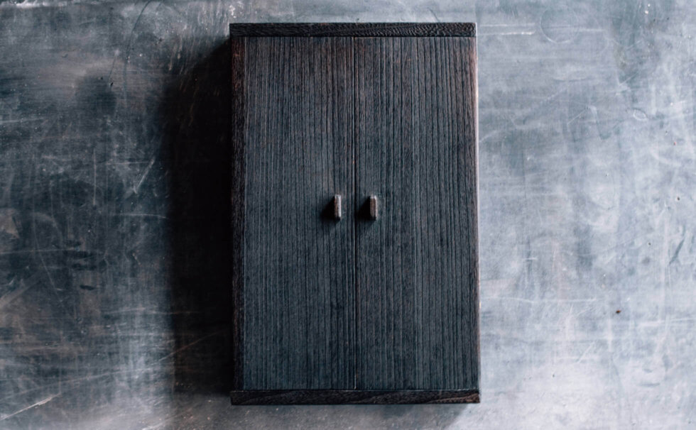 何度も上から紫を重ねることで、紫帯びた黒を表現。光に当てると紫が浮き出て重厚な味わいと厳かな雰囲気を演出する。